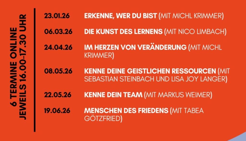 Der Kurs ‚missionale Leitung mit Material von Bob und Mary Hopkins‘ ist ein sechsteiliger Kurs für Menschen, die in christlichen Gruppen und Kirchen haupt- oder ehrenamtlich Leitungsverantwortung tragen.